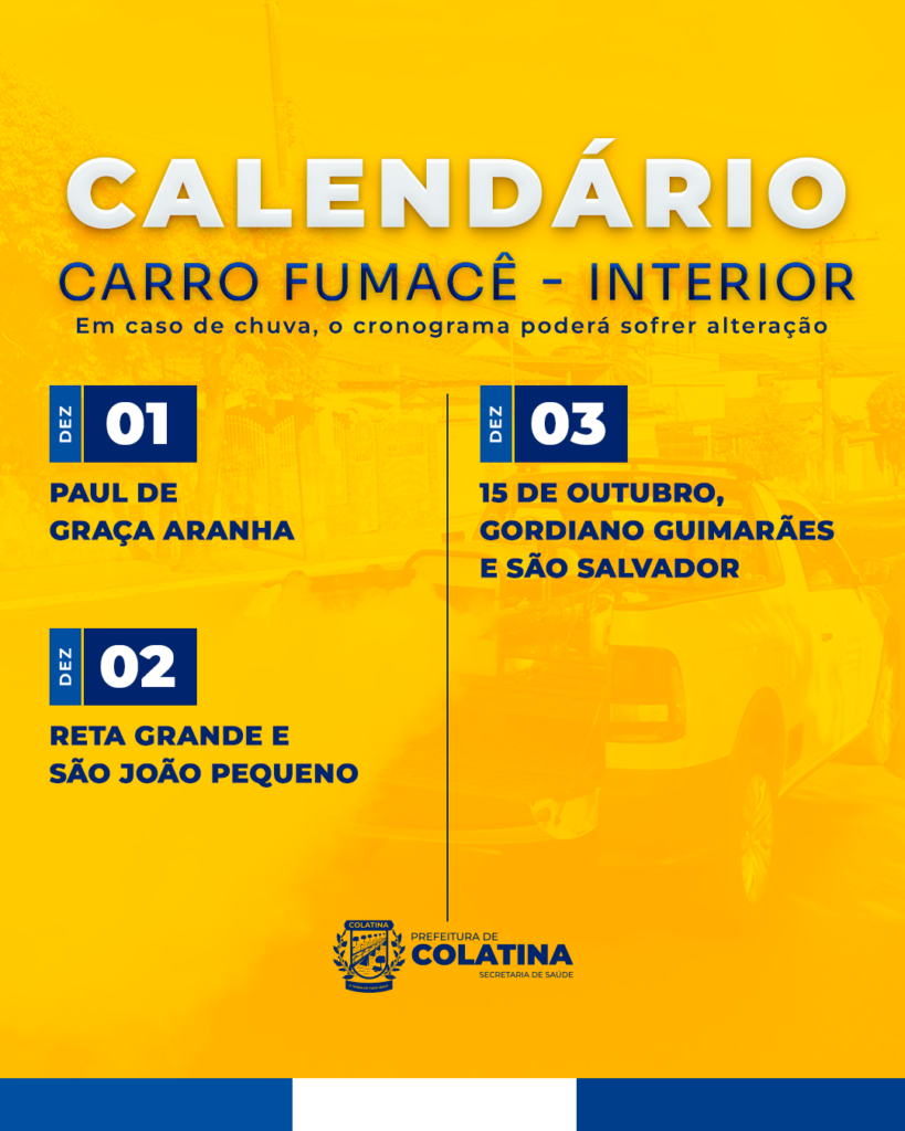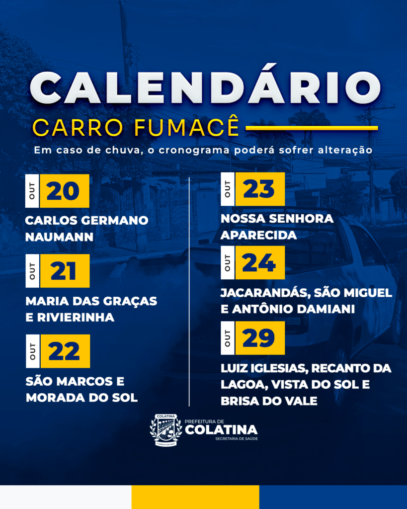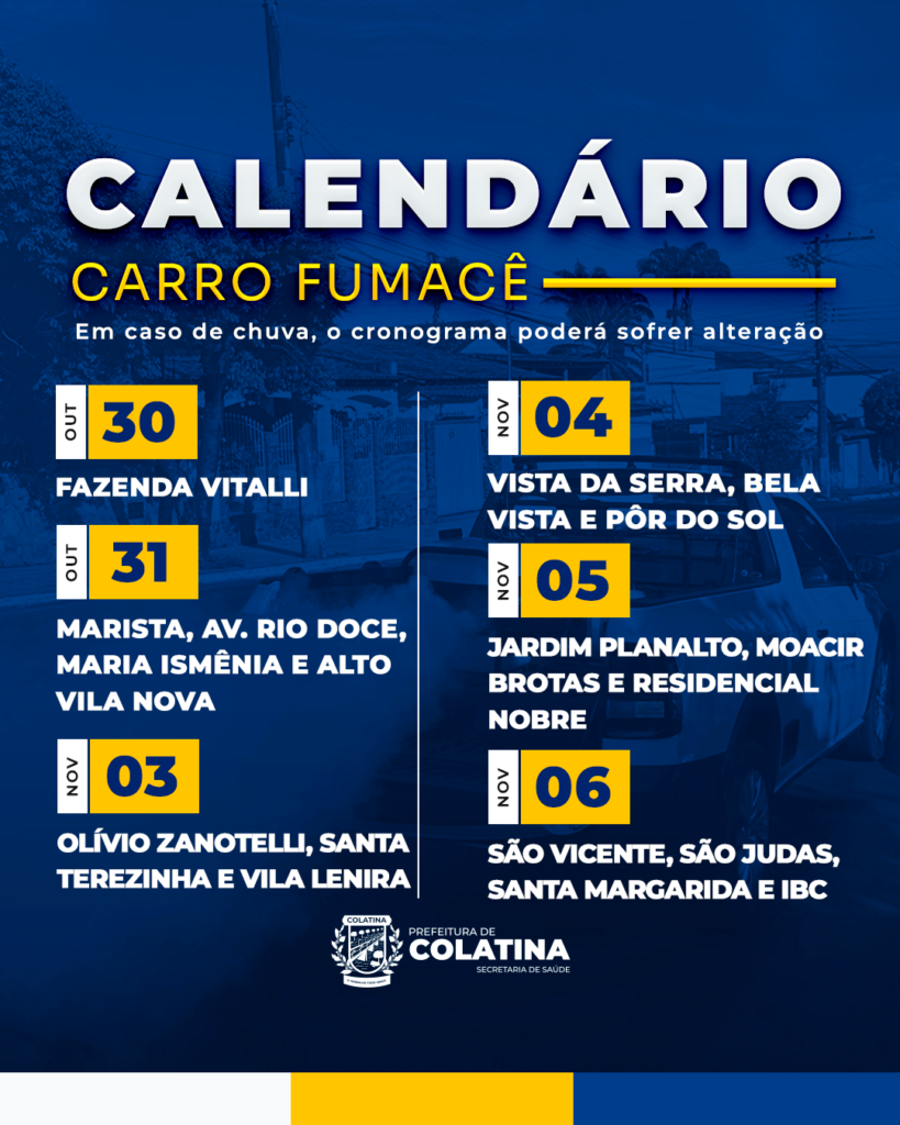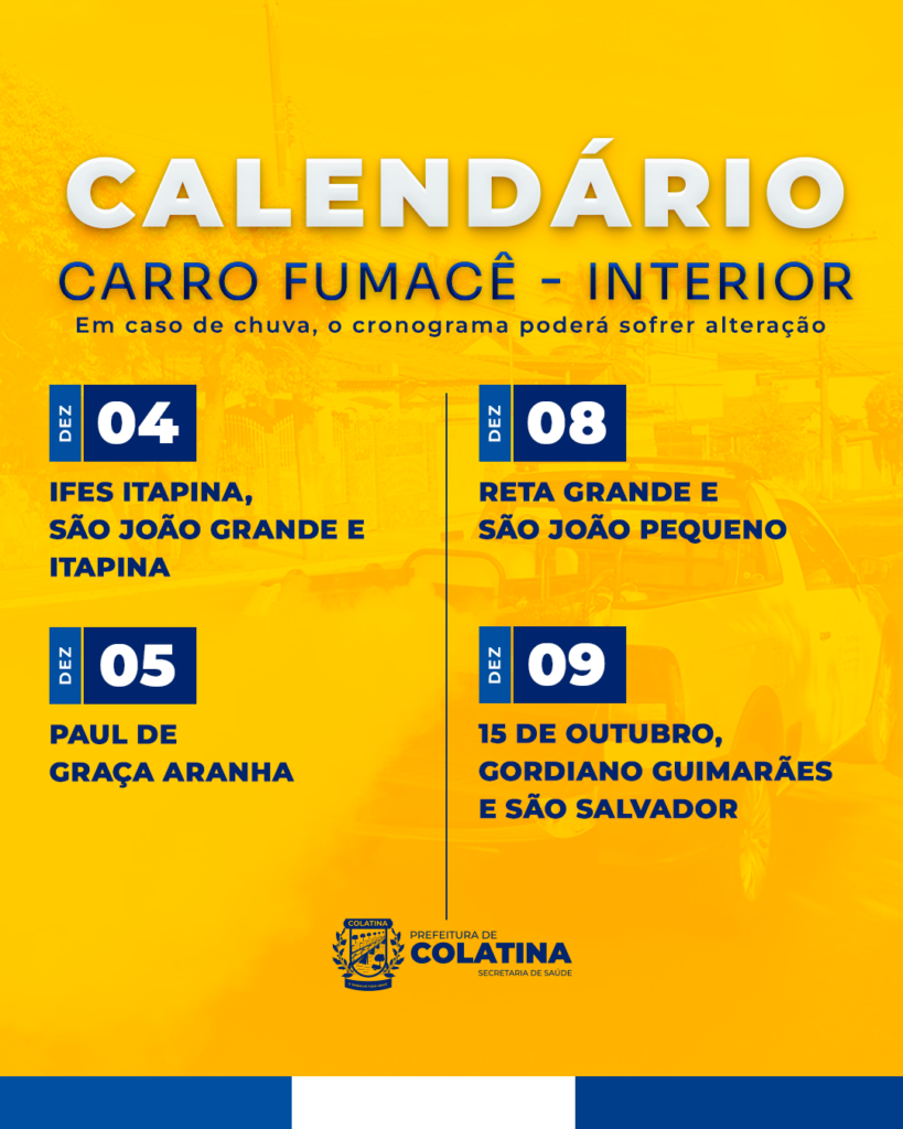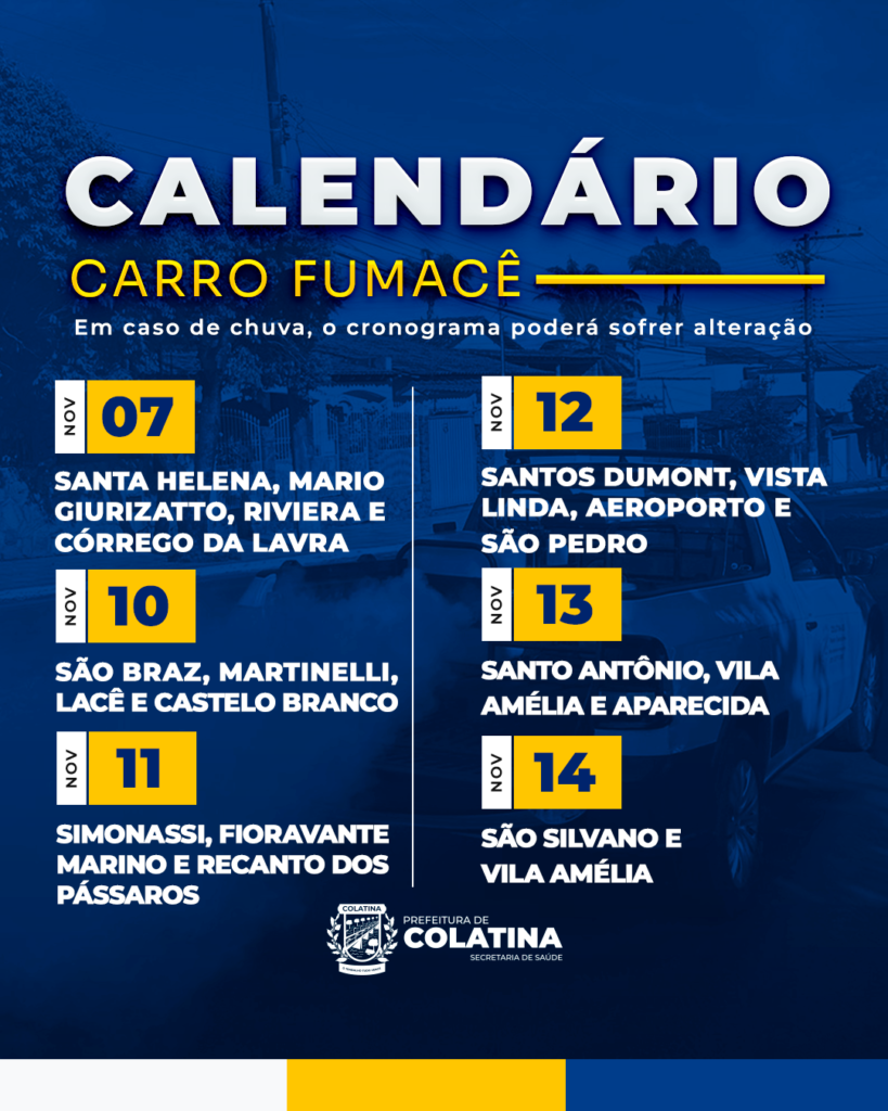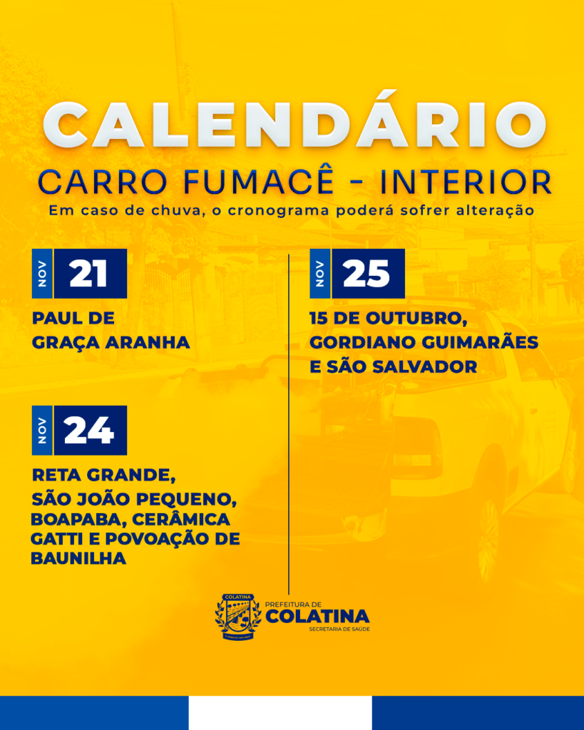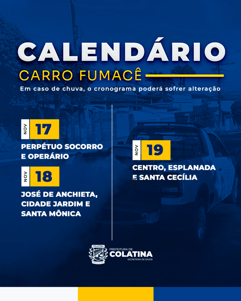 A Secretaria de Saúde de Colatina alerta que o cronograma poderá sofrer alterações em função das condições climáticas, especialmente devido ao período de chuvas.
